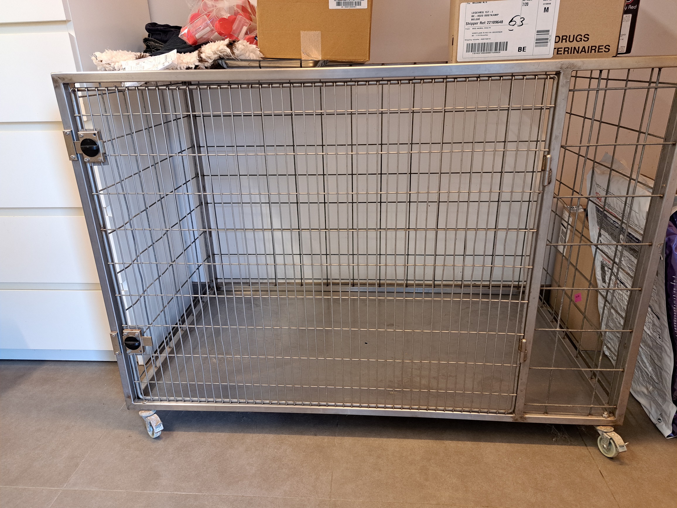 Door een smid met de hand gemaakt. Volledig inox. Handig voor de echt grotere honden. Op wieltjes.
